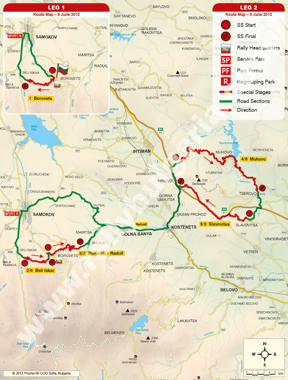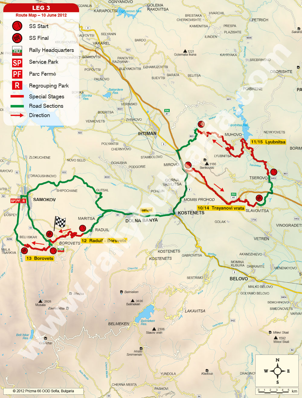 В Съботанай-дългатаотсечка е Мухово 1 и 2, 29.45 км, а в Неделния ден Любница 1 и 2, 30.38 км. Тези две отсечкикаранипо два пътищесарешаващизапобедата в РалиБългария 2012. Зазрителитенай-подходяща с атрактивнизавойсаотсечкитеБелиИскър 1 и 2, и Боровец – БелиИскър. През 3 дневнотосъстезаниещесекаратобщо 15 отсечки с дължина 249.88 км, свободенпреходот 397.79 км и общо 647.68 км. В процентносъотношениесъстезателнатадистанция е 39%, коетоправисъстезаниетомногокомпактно. Графикнаралитоможедаизтеглитетук. Картинаскоростнитеотсечки: Ден 1 и 2, Ден 3. Предишнипобедители: