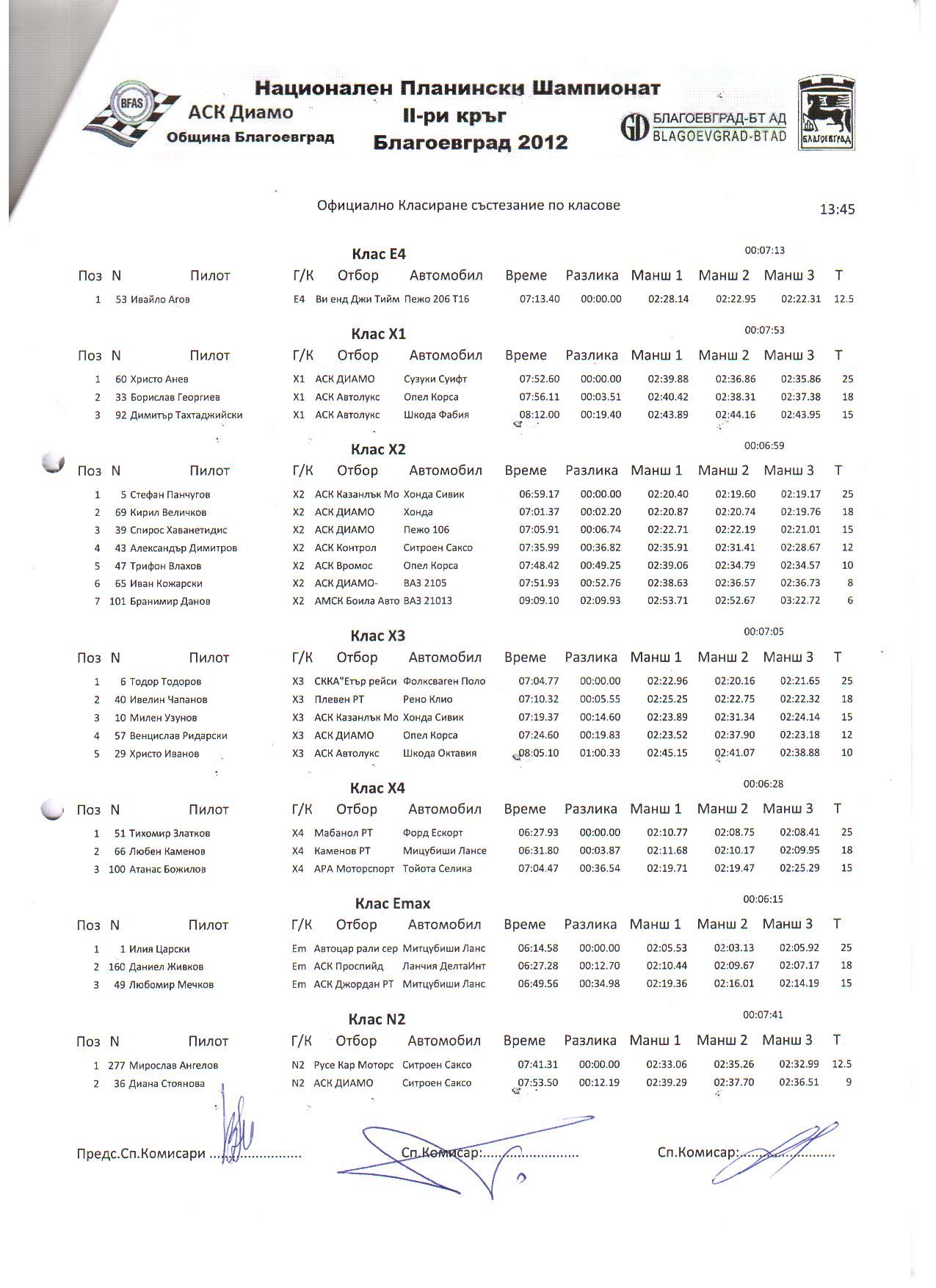 Класиране в Българският Рали Шампионат 2012 (Официално