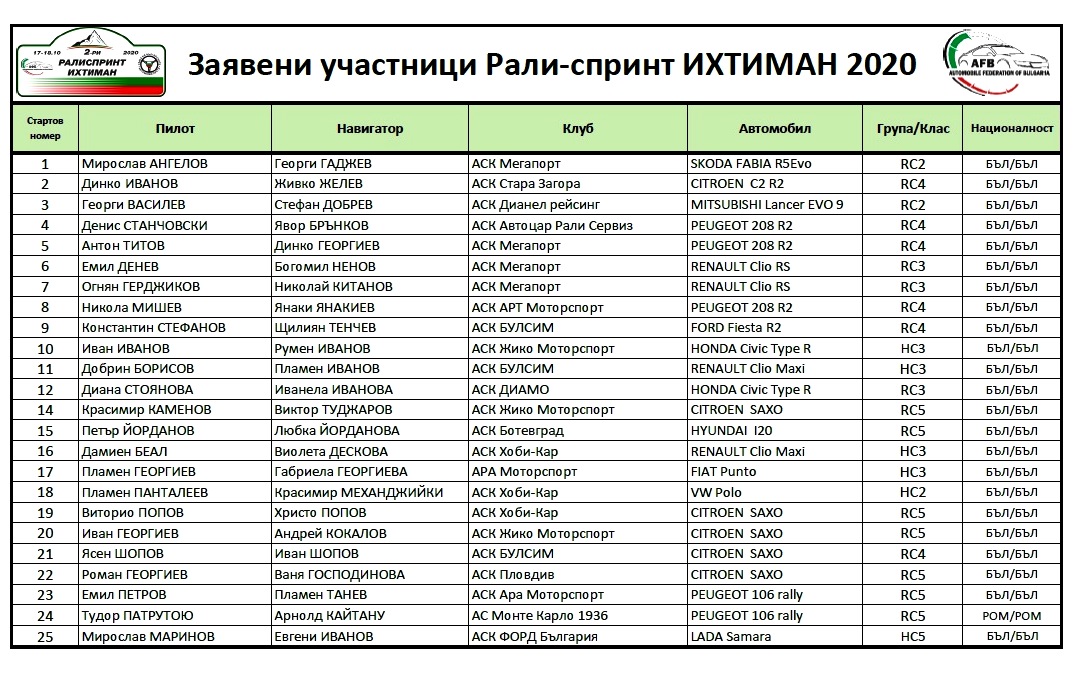 | Рали Твърдица 2020 | Общо Класиране: Планински Шампионат 2019 | ||||||||||||||||||||||||||||||||||||||||||||||||||||||||||||||||||||||||